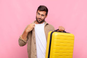 Uśmiechnięty mężczyzna trzymający konserwy i paszporty w pobliżu walizki na niebieskim tle