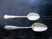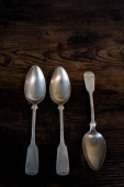 trzy łyżki leżą na stole, podczas gdy jedna leży na odwrót.