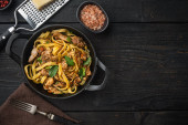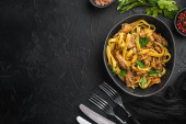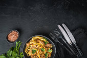 królik gulasz tagliatelle zestaw, w misce, na czarnym kamiennym tle, widok z góry płaski lay