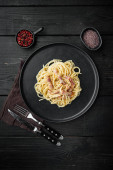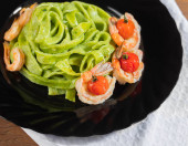 Włoski makaron spaghetti z grillowanymi krewetkami, zestaw sosu pesto, na talerzu, na czarnym tle