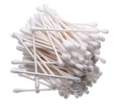 Bawełniane waciki na drewnianej podstawie na uszy zbliżenie na białym tle. Izolacja