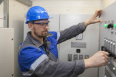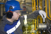Mechanik - mechanik ustawia licznik gazu, oprzyrządowanie do naprawy ślusarzy, pracownik w wyposażeniu ochrony osobistej, portret z bliska, środki ostrożności