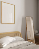 Zdjęcie "Mała i stylowa sypialnia z białymi roletami okiennymi na ścianach i szklanych drzwiach" może być wykorzystywane do celów osobistych i komercyjnych zgodnie z warunkami zakupionej licencji Royalty-free. Obraz jest dostępny do pobrania w jakości wysokiej rozdzielczości do 5760x3840.
