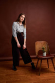 Brunetka wyciągnęła ręce z przodu, składając palce w trójkąt i patrząc przez nie. Ręce nieostre. Twarz ładnej brunetki w niebieskim swetrze przez dłonie.