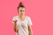 niezadowolony młody kaukaski dziewczyna dotykając włosy odizolowane na fioletowy tło studio portret