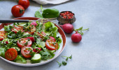 Świeża letnia sałatka warzywna z rukolą, pomidorami, papryką, awokado i łososiem na talerzu widok z góry, zdjęcie z wolnym miejscem na tekst