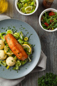 Świeża sałatka warzywna z rukolą, pomidorami, papryką, awokado i łososiem na talerzu z bliska zdjęcie pionowe