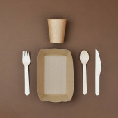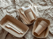 odpady z tworzyw sztucznych, które nie ulegają degradacji, pochodzące z jednorazowych zastaw stołowych oraz zestaw naczyń z materiałów pochodzących z recyklingu ekologicznego na zielonym tle. Koncepcja odrzucenia tworzyw sztucznych, ochrona środowiska