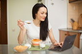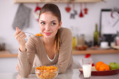 brunetka dziewczynka jedzenie śniadanie z mlekiem w kuchni