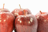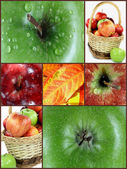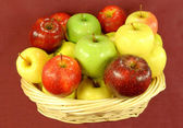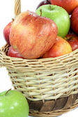 kosz z różnego rodzaju jabłek z wody spadnie ponad w grupie nad białym.