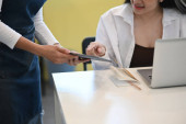 Zdjęcie "Kelnerka przyjmująca zamówienia od klientów przychodzących do kawiarni przy użyciu tabletu do otrzymywania zamówień." może być wykorzystywane do celów osobistych i komercyjnych zgodnie z warunkami zakupionej licencji Royalty-free. Obraz jest dostępny do pobrania w jakości wysokiej rozdzielczości do 5760x3840.