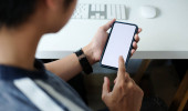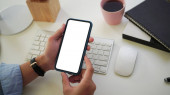 Close up widok młody człowiek trzyma makiety smartfon z pustym ekranem podczas siedzenia w jego miejscu pracy.