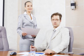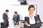 młoda i atrakcyjna kobieta w biurze z kolegami na tle