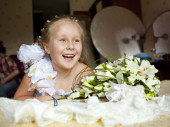 piękne dziewczynki w białej sukni siedzi na kanapie w domu, prezent