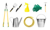 Zestaw z różnymi narzędziami ogrodniczymi na białym tle. Projekt banera