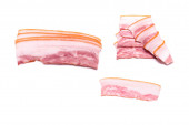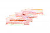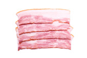 Surowe plastry bekonu odizolowane na białym tle. Widok z góry.