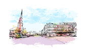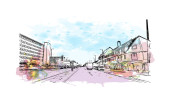Drukuj Widok budynku ze znakiem rozpoznawczym Bergen to miasto w Norwegii. Akwarela plusk z ręcznie rysowane szkic ilustracja w wektor.