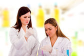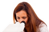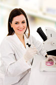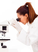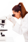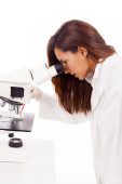 portret student medycyny szuka przez Mikroskop w labora