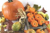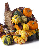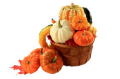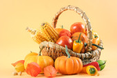 jeszcze zdjęcie świeżo zebranych z gospodarstwa pole owoce i melony, rosliny basztanowe i żwirowe kabaczki w buszel drewniany kosz na białym tle.