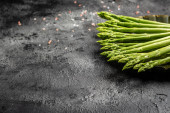 pieczone szparagi z pomidorami cytrynowymi i wiśniowymi, zdrowe jedzenie, dieta menu. Długi format banera, widok z góry.
