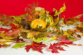 spadek kwiaty, suche liście i drewniany kosz to typowe dla skład jesień na białym tle.