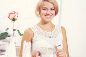 młoda dziewczyna siedzi na kanapie w domu przy lampce wina