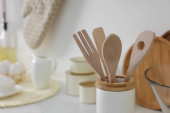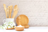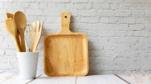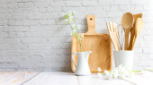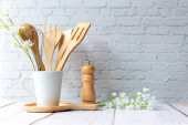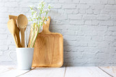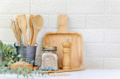 Narzędzia kuchenne i naczynia kuchenne obiekt na półce kuchennej drewno białe dla zdrowego odżywiania i opieki zdrowotnej. Ściana biały cegła tło, kopia przestrzeń dla tekst