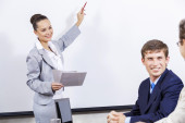 młoda i atrakcyjna kobieta w biurze z kolegami na tle