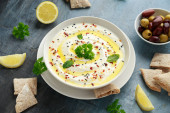 Ser śmietankowy Labneh z oliwą z oliwek, sól, zioła podawane z oliwkami, chleb pita w białej misce