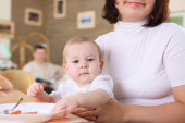 Młoda rodzina w domu je posiłek z dzieckiem