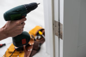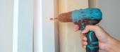 Wykonawca pracujący z elektryczną śrubokrętem. Człowiek naprawić deskę na ścianie