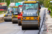 Asfalt w wiadrze asfalt brukarz podczas budowy dróg. Naprawa dróg