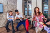 Grupa zabawy wraz z grą limbo na imprezie biurowej.