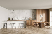 Zdjęcie "Beżowy pokój kuchenny ze stołem i trzema krzesłami, widok z przodu, drewniana podłoga. Zestaw do gotowania wnętrz z półką i stolikiem, okno z widokiem na naturę, renderowanie 3D bez osób" może być wykorzystywane do celów osobistych i komercyjnych zgodnie z warunkami zakupionej licencji Royalty-free. Obraz jest dostępny do pobrania w jakości wysokiej rozdzielczości do 5760x3840.