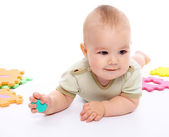 ładny mały chłopiec bawi się z zabawki, siedząc na podłodze, na białym tle nad białym