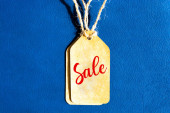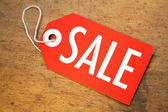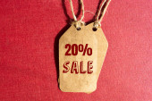 Brązowa metka na czerwonym tle. Widok z góry, odbiór. Wieszak z tekstem "Sprzedaż"