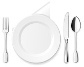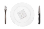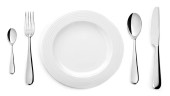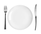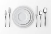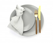 Piękne ustawienie stołu z ciemnoszarą serwetką na białym tle, widok z góry