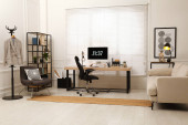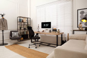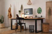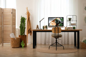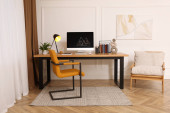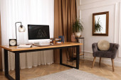 Zdjęcie "Nowoczesne miejsce pracy z komputerem w pokoju. Projekt wnętrza" może być wykorzystywane do celów osobistych i komercyjnych zgodnie z warunkami zakupionej licencji Royalty-free. Obraz jest dostępny do pobrania w jakości wysokiej rozdzielczości do 5760x3840.