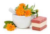 ręka trzyma kwiat i mydło na białym tle nad białym