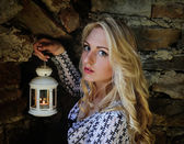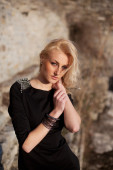 Sexy blond kobieta opierając się starożytny kamienny mur