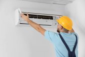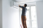 mechanik w masce medycznej stojący na drabinie i naprawiający klimatyzator