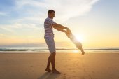 szczęśliwy ojciec z jego dziecko nad brzegiem morza na zachód, suma