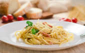 carbonara makaron na drewnianym stole