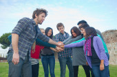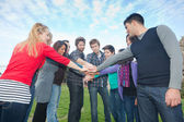 szczęśliwy studentów z rąk na stos