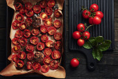Sos pomidorowy i składniki na ciemnym drewnianym tle.