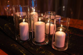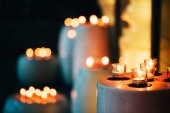 Świece palą się na świeczniku w ciemnym niebieskim tle.