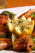 świeże i kolorowe grillowane krewetki i warzywa szaszłyki na liści palmy, w stylu tajskim