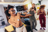 Zdjęcie "Młoda kobieta śpiewająca do mikrofonu na imprezie domowej. Koncepcja wieczoru panieńskiego, karaoke, koncertu muzycznego i wakacji " może być wykorzystywane do celów osobistych i komercyjnych zgodnie z warunkami zakupionej licencji Royalty-free. Obraz jest dostępny do pobrania w jakości wysokiej rozdzielczości do 5760x3840.