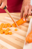 kobiety w rękę krojenia marchewki na pokładzie cięcia drewna