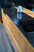 Nowoczesny zlewozmywak z czarnym kranem w nowo zaprojektowanej kuchni z szarym blatem i backsplash i stylowe niebieskie szafki